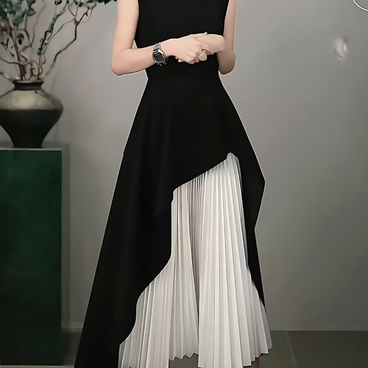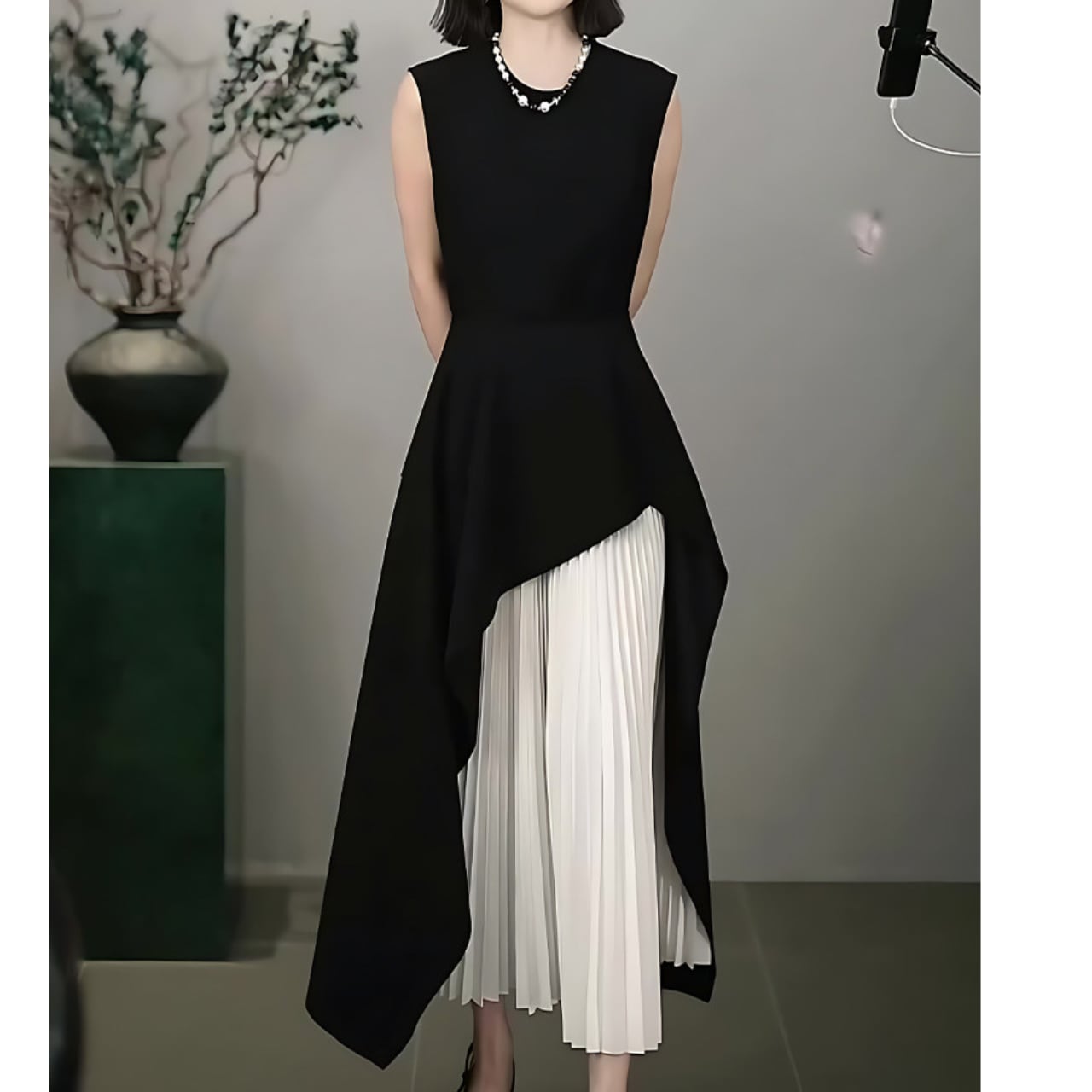 ・アシンメトリーなデザインが目を惹く、洗練された印象のノースリーブワンピース。