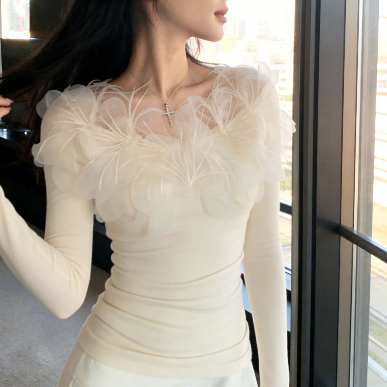 ・繊細なフェザー調ディテールが印象的な、上品さと女性らしさを兼ね備えたトップスです。