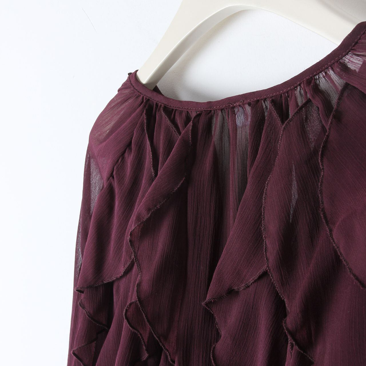 ・ブラウスは深みのあるワインカラーに、たっぷりとあしらわれたフリルと透け感のある素材が女性らしさを引き立てます。動くたびにふんわりと揺れる袖が、華やかで印象的な一着です。