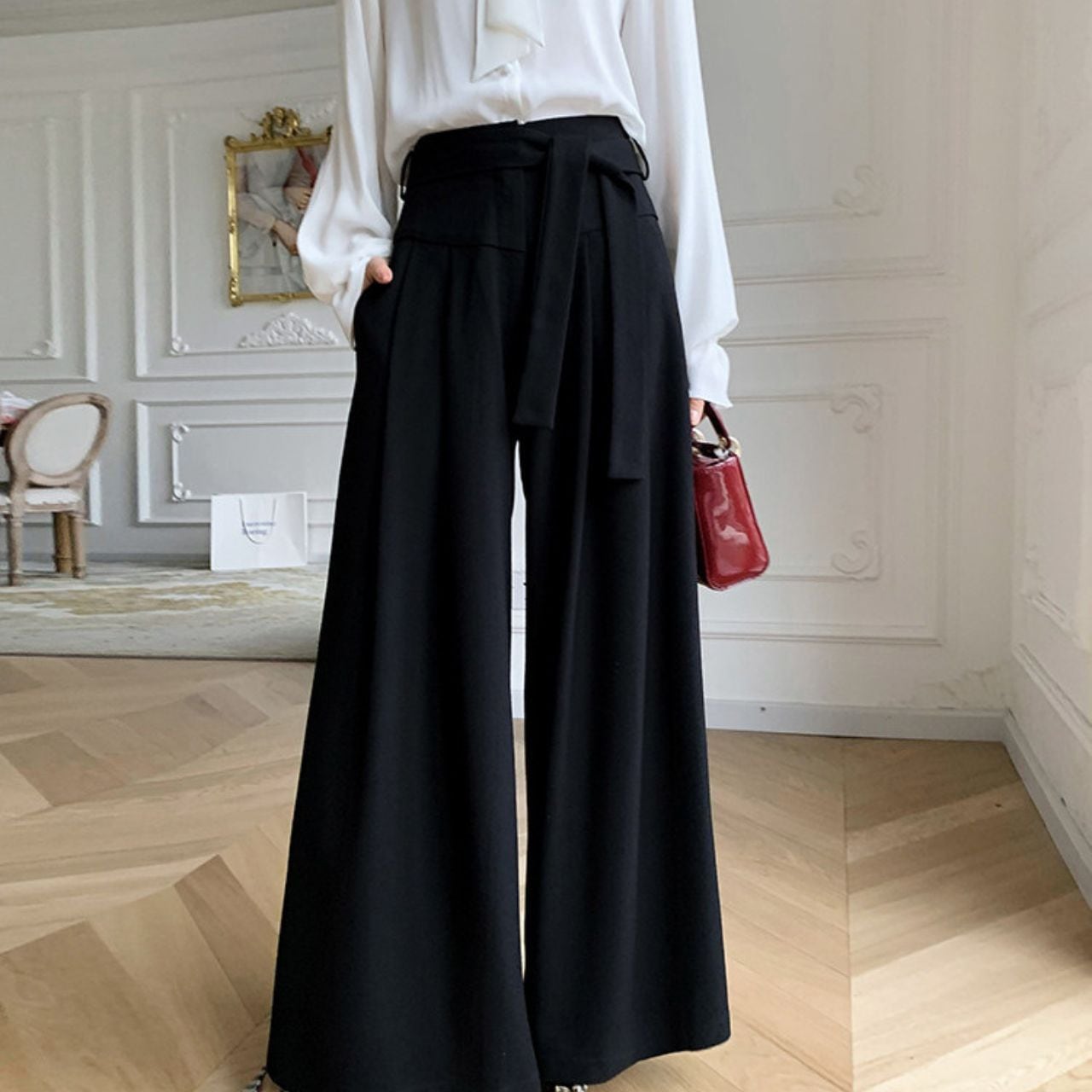 【2set】Sheer Ruffle Blouse & Pleated Wide Pants L00900