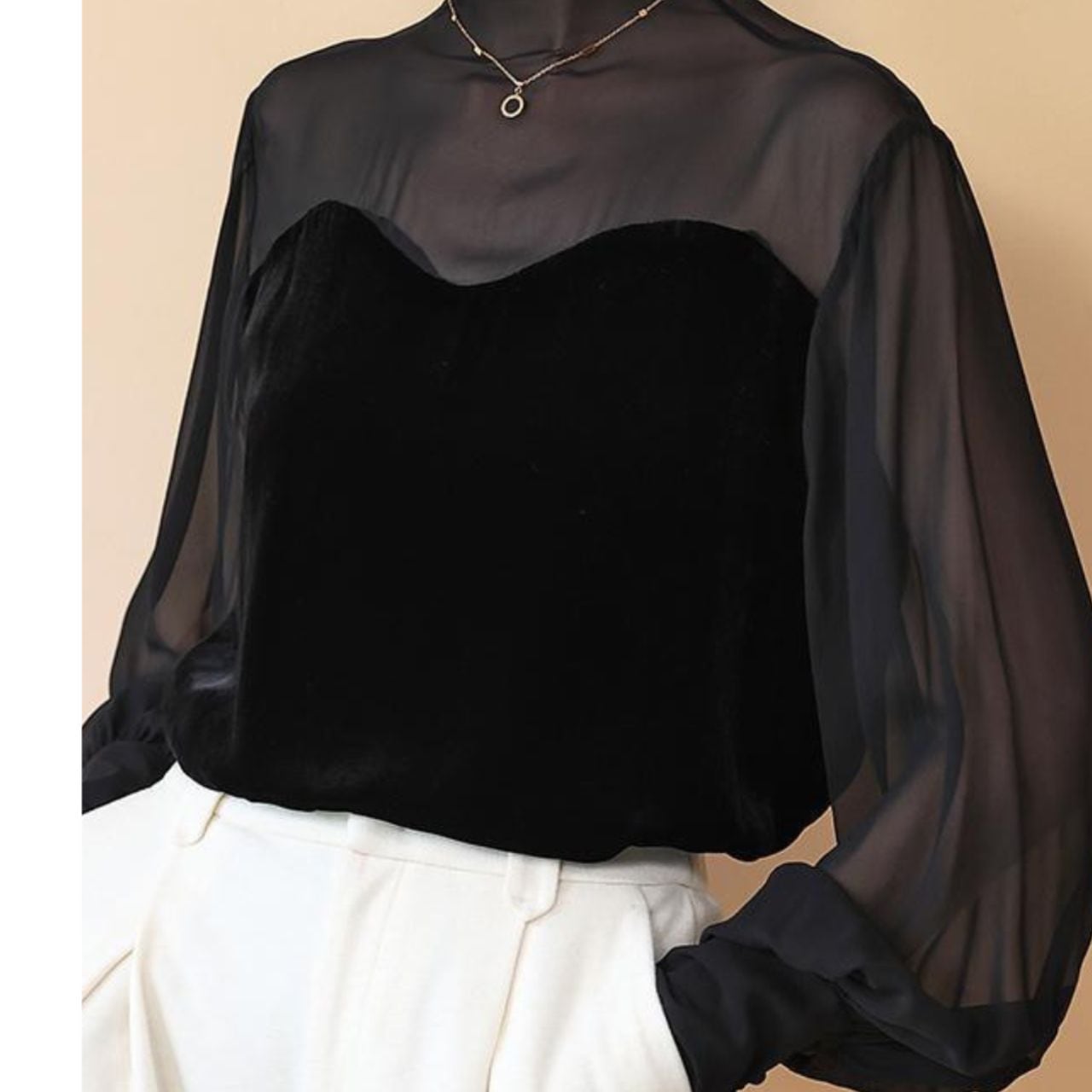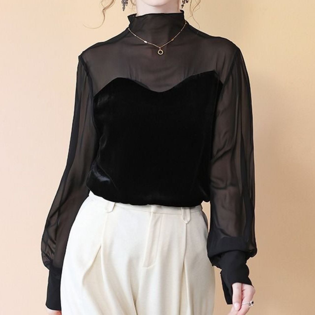 ・トップスは、ハイネック×シアー素材の絶妙なバランスが魅力。デコルテや腕にほんのり透け感を持たせることで、上品な女性らしさと抜け感を演出します。