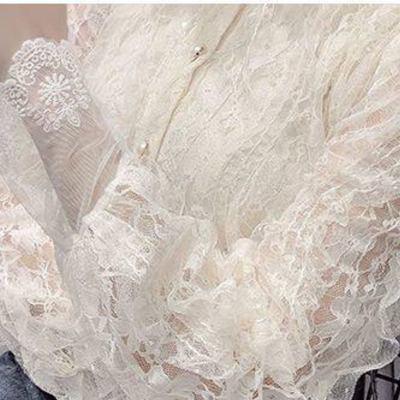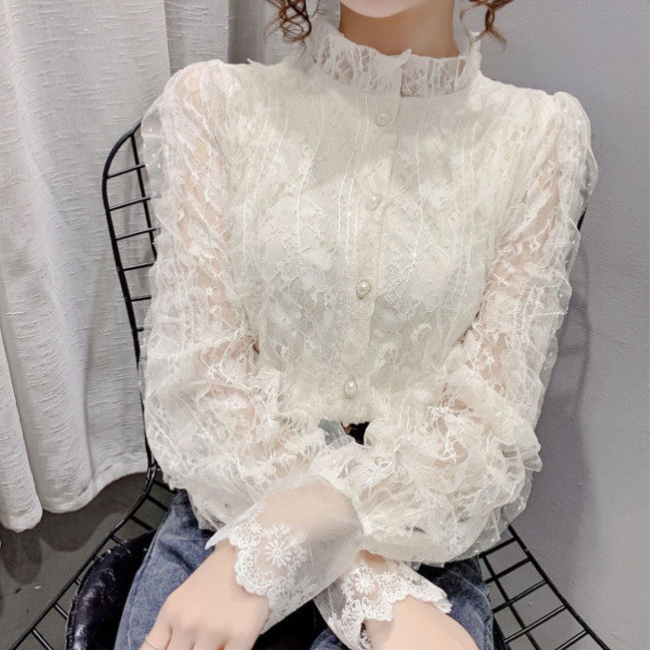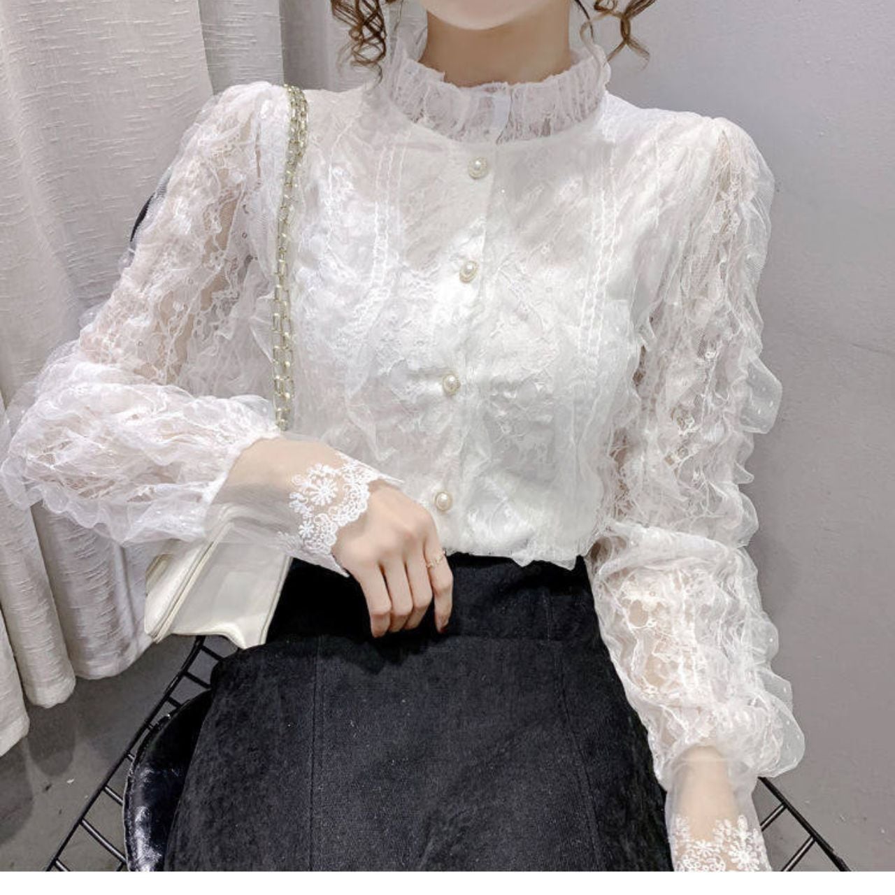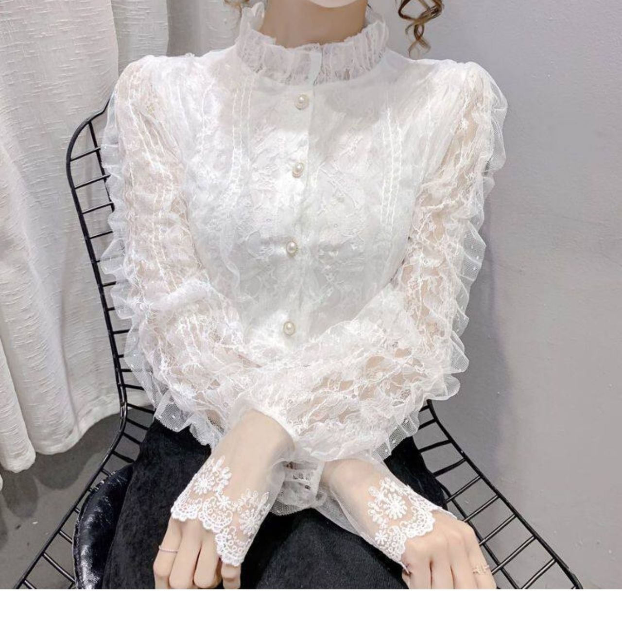 Frill Neck Lace Button Front Blouse L00907