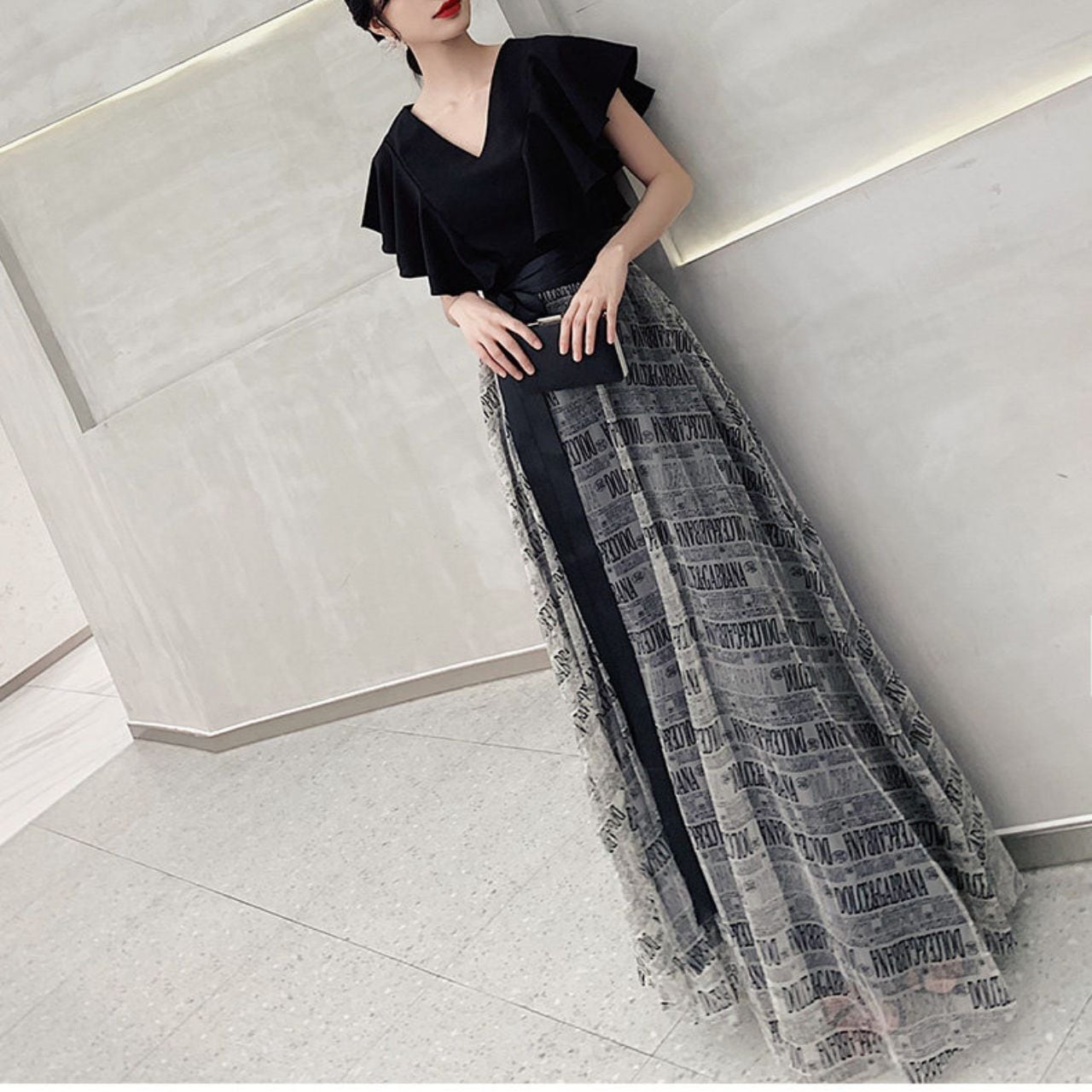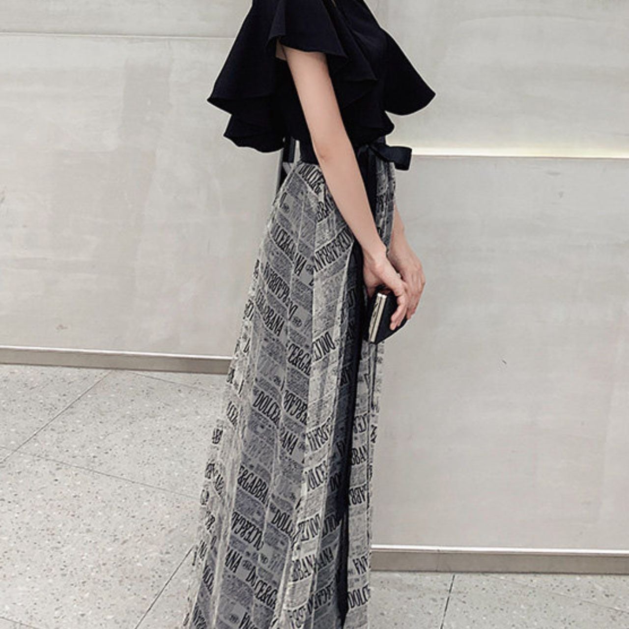 ふんわりと広がるAラインシルエットが魅力的なマキシ丈ワンピース。