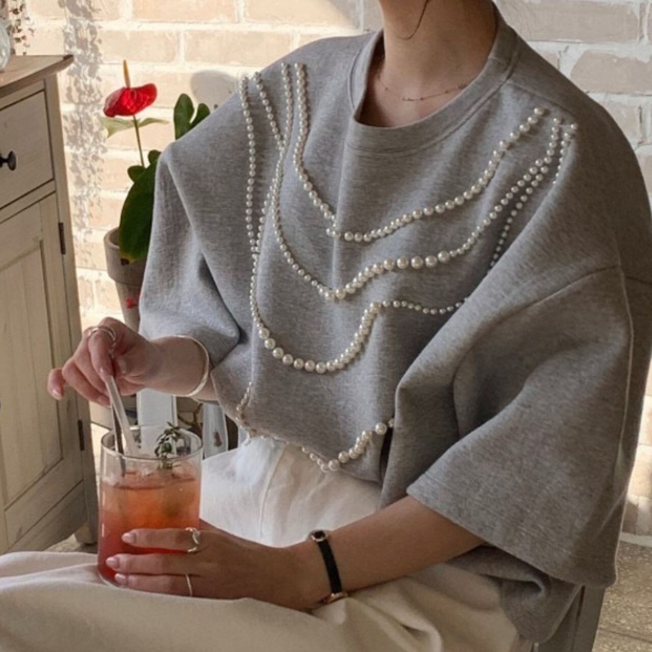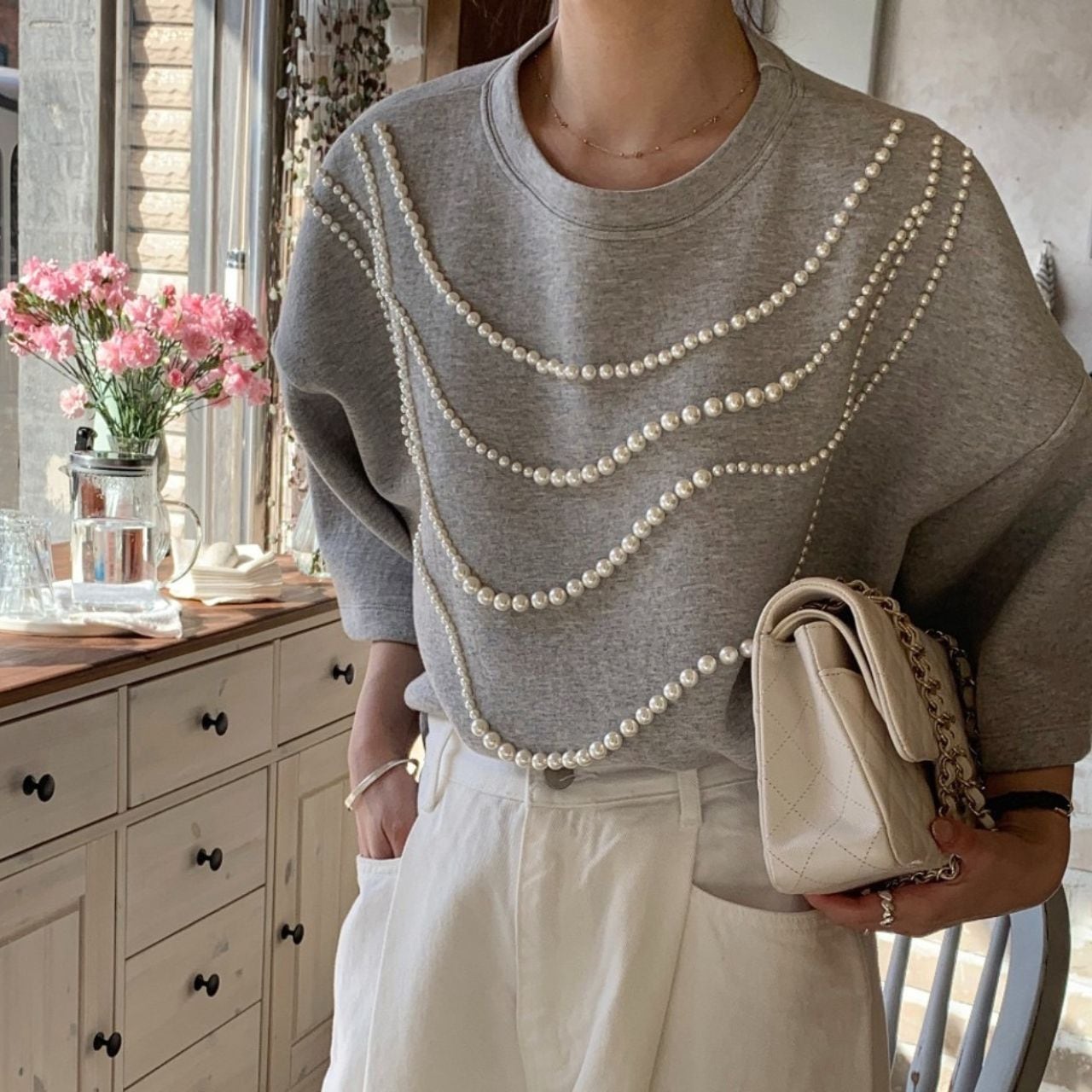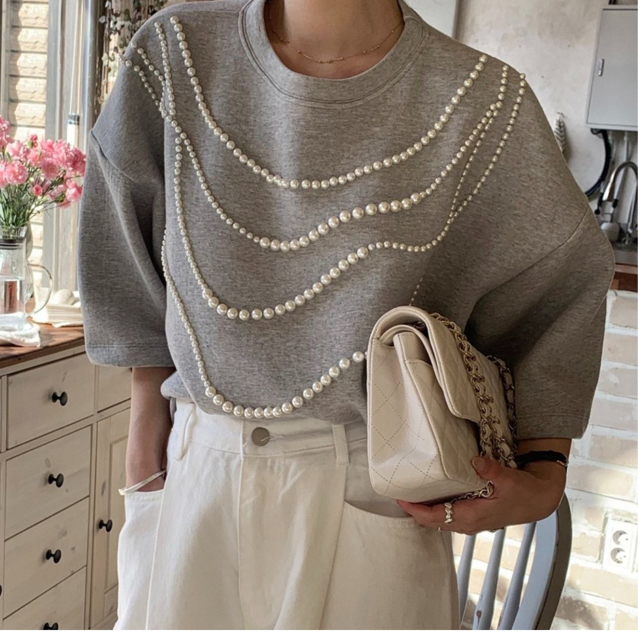 ・トップスはゆったりとしたシルエットに、流れるように配置されたパールが上品さをプラス。