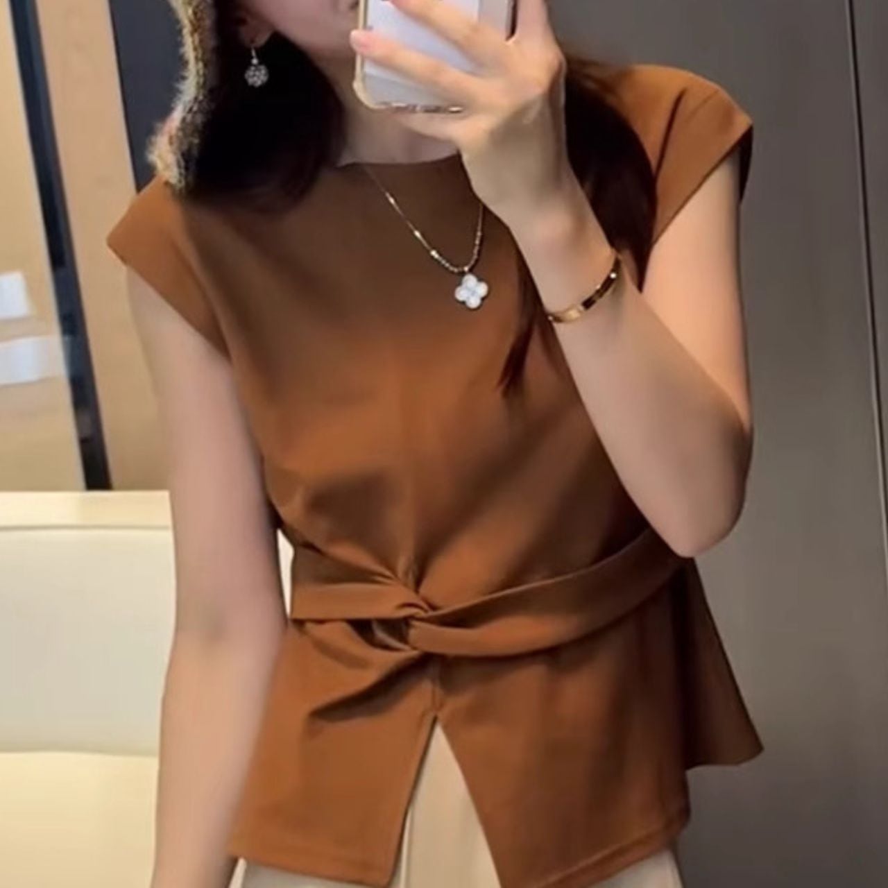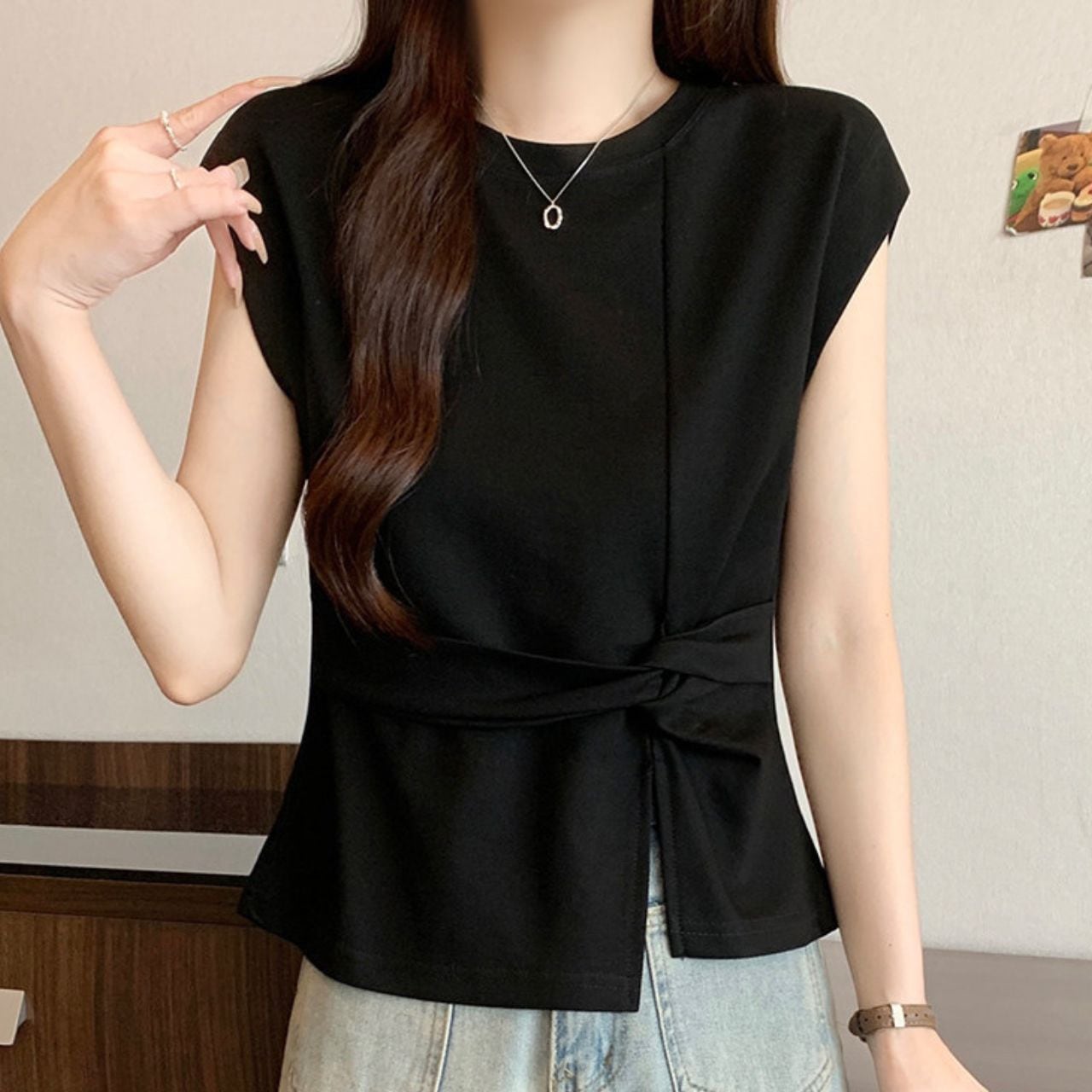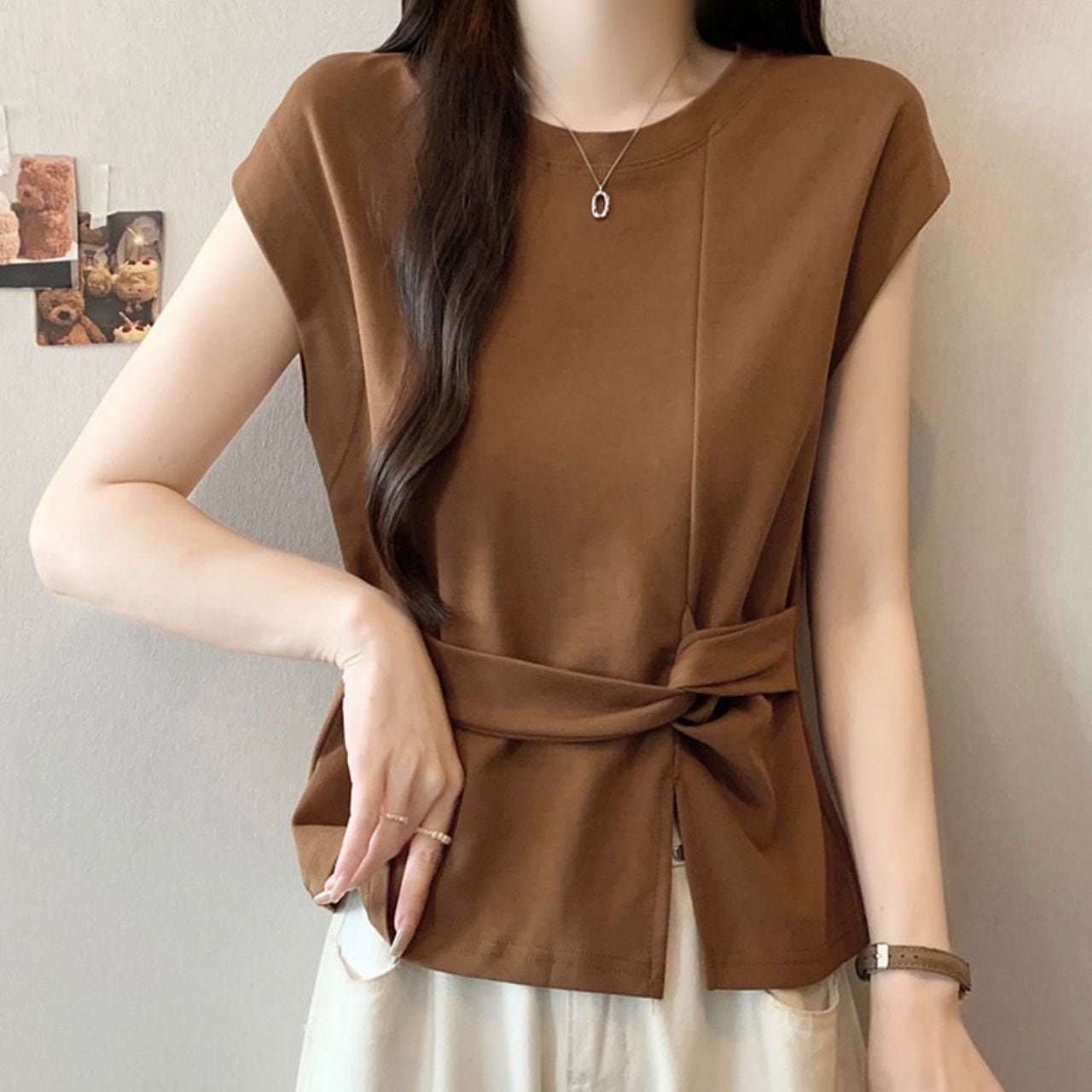 ・ウエストベルトがアクセントのノースリーブカットソーは、1枚で着映えするアイテムです。